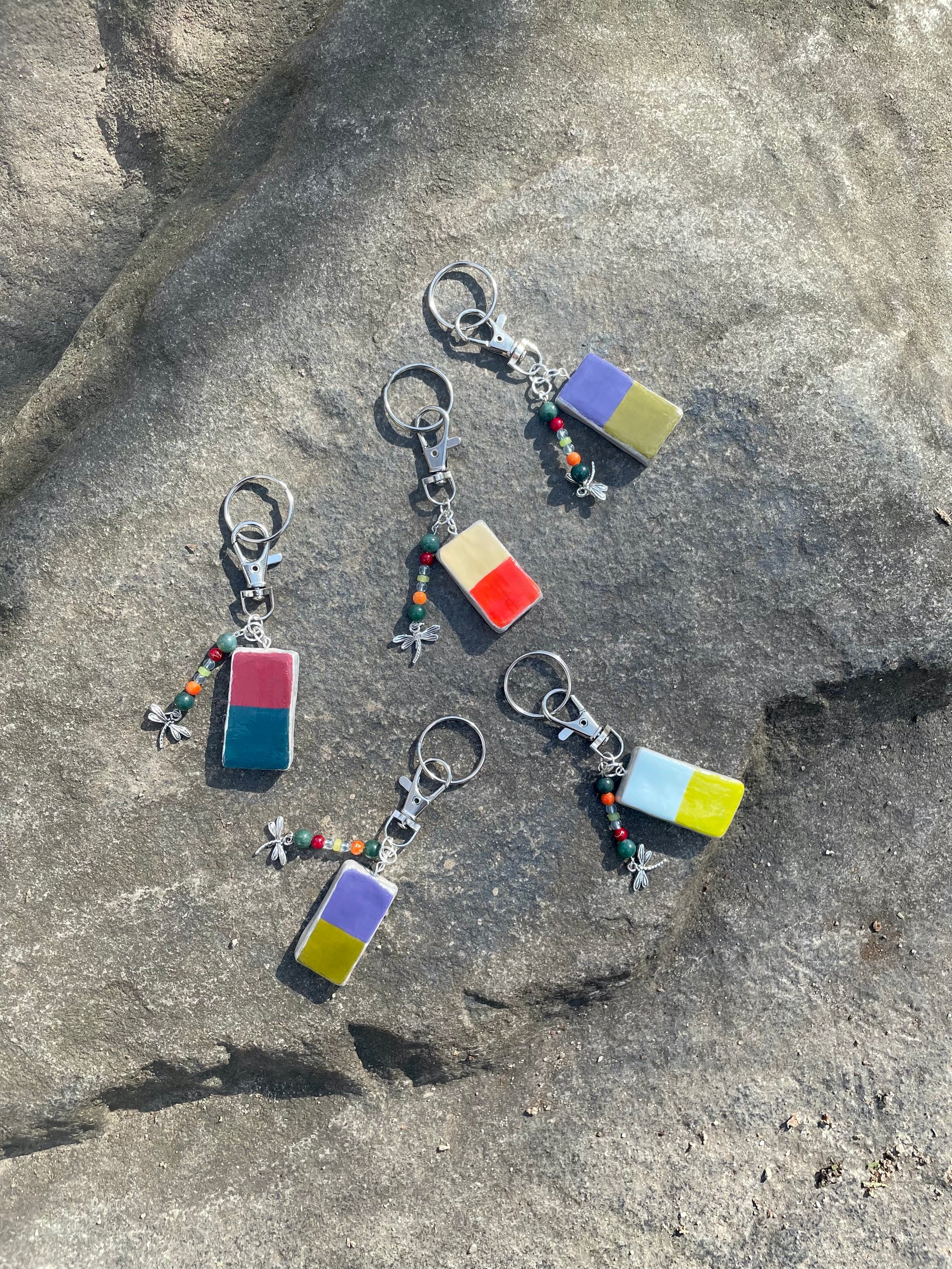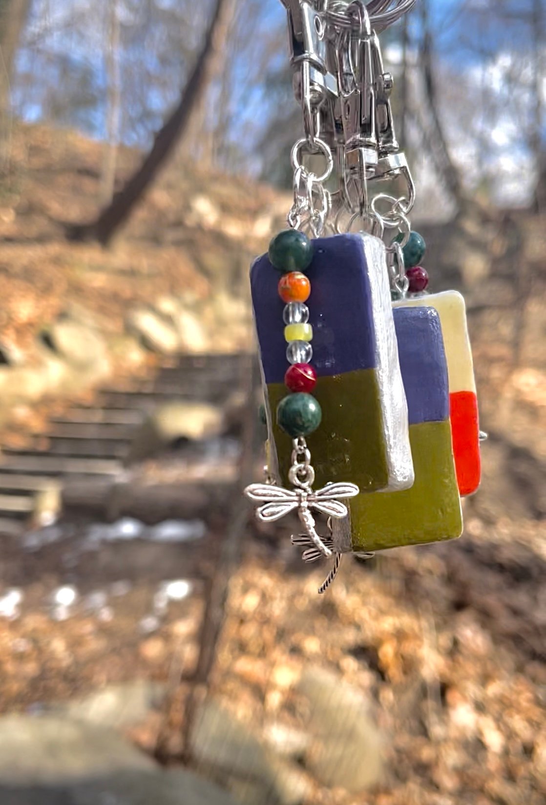 keychains feature handmade painted clay charms inspired by haishoku soukan color pairings // charms have silver edges and a gloss finish // coordinated beaded strands feature moss agate and silver dragonflies