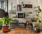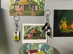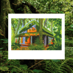 cue (women vocalizing) // instax wide-sized print with a lush, colorful reimagining of a moss-covered cabin