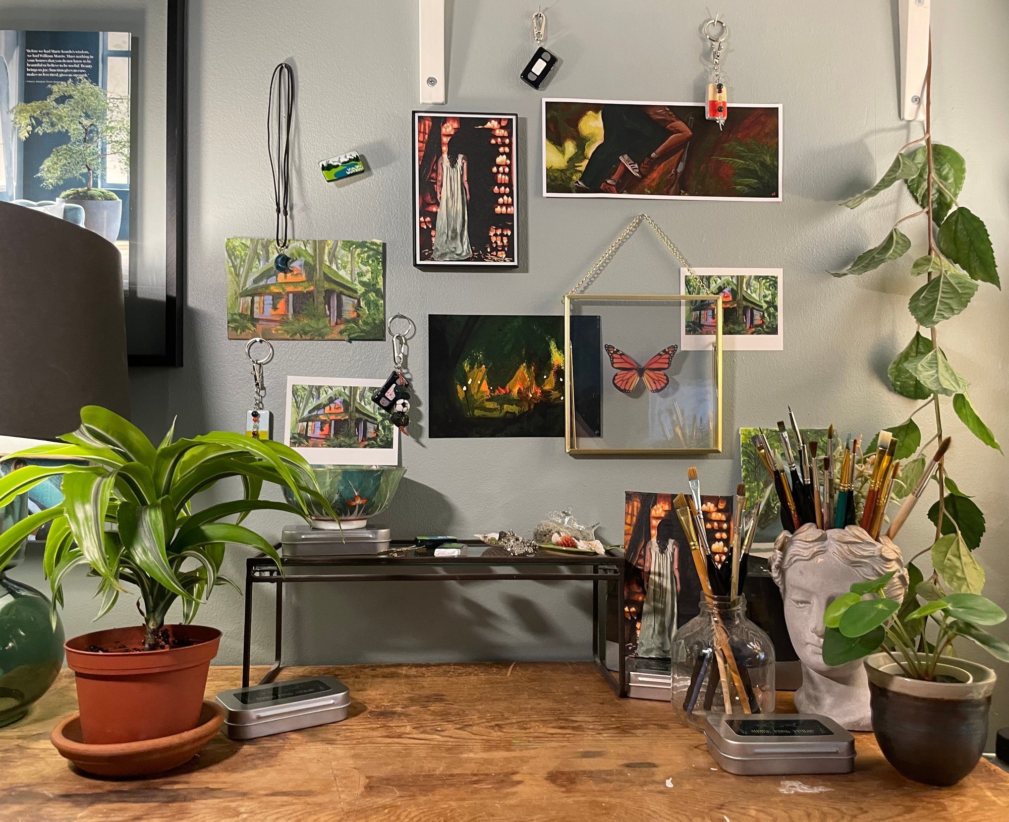 I focused on the use of color in this piece, using orange underlayers as a symbol of gender noncomformity, and touches of lavender to queer the structure of the cabin & the wilderness around it. Mostly it was just fun to make while thinking about my favorite show, iykyk <3