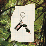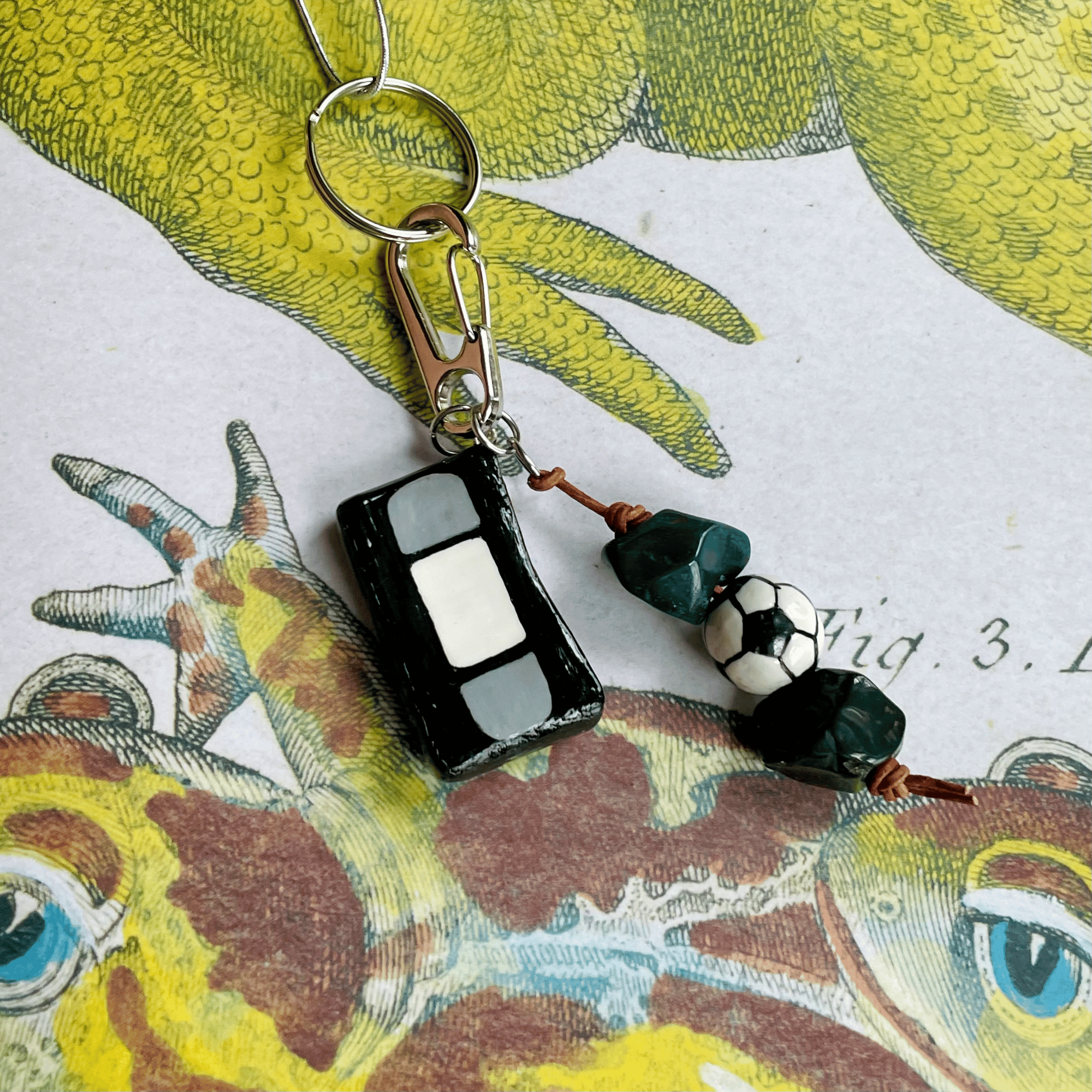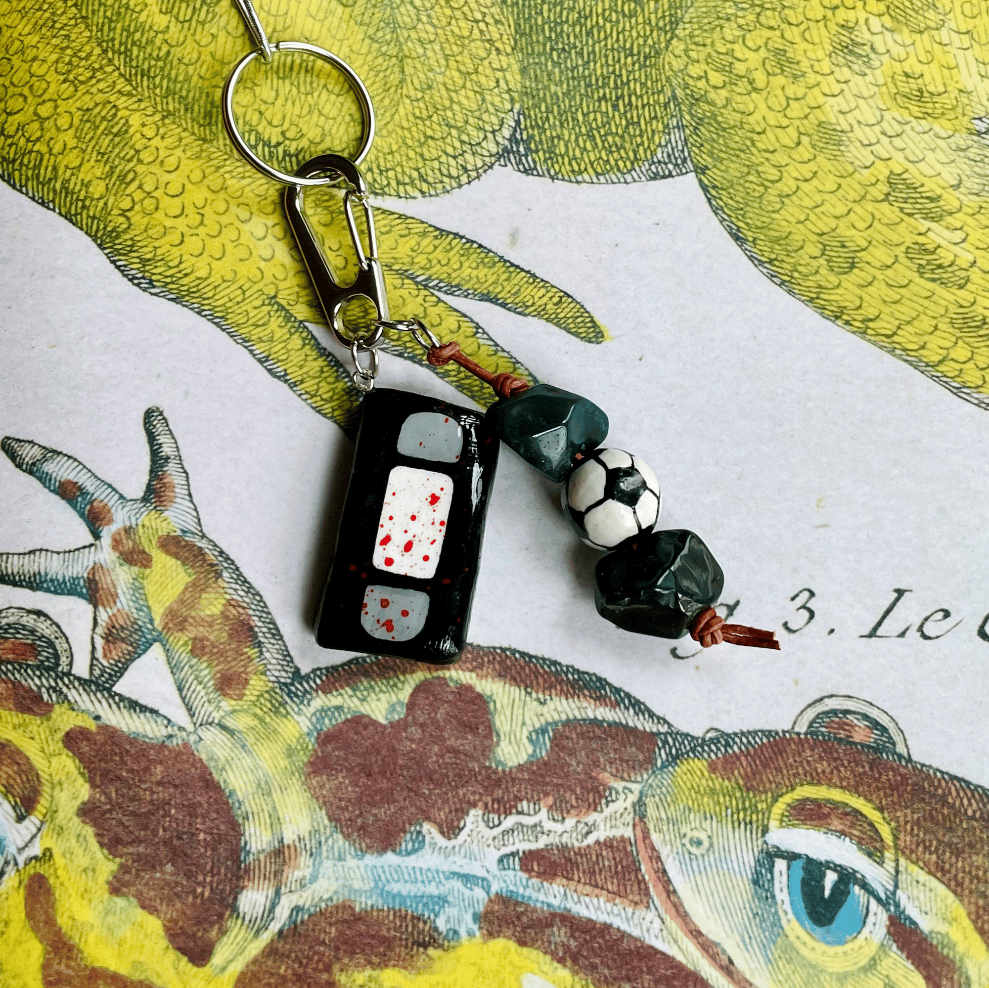 keychain features a blood-splattered vhs charm, a porcelain soccer ball and bloodstones threaded on antique leather cord, all attached to a stainless steel carabiner // keychain is fully handmade from clay and acrylic paint and finished with nontoxic glaze // comes packaged in a reusable decorative tin
