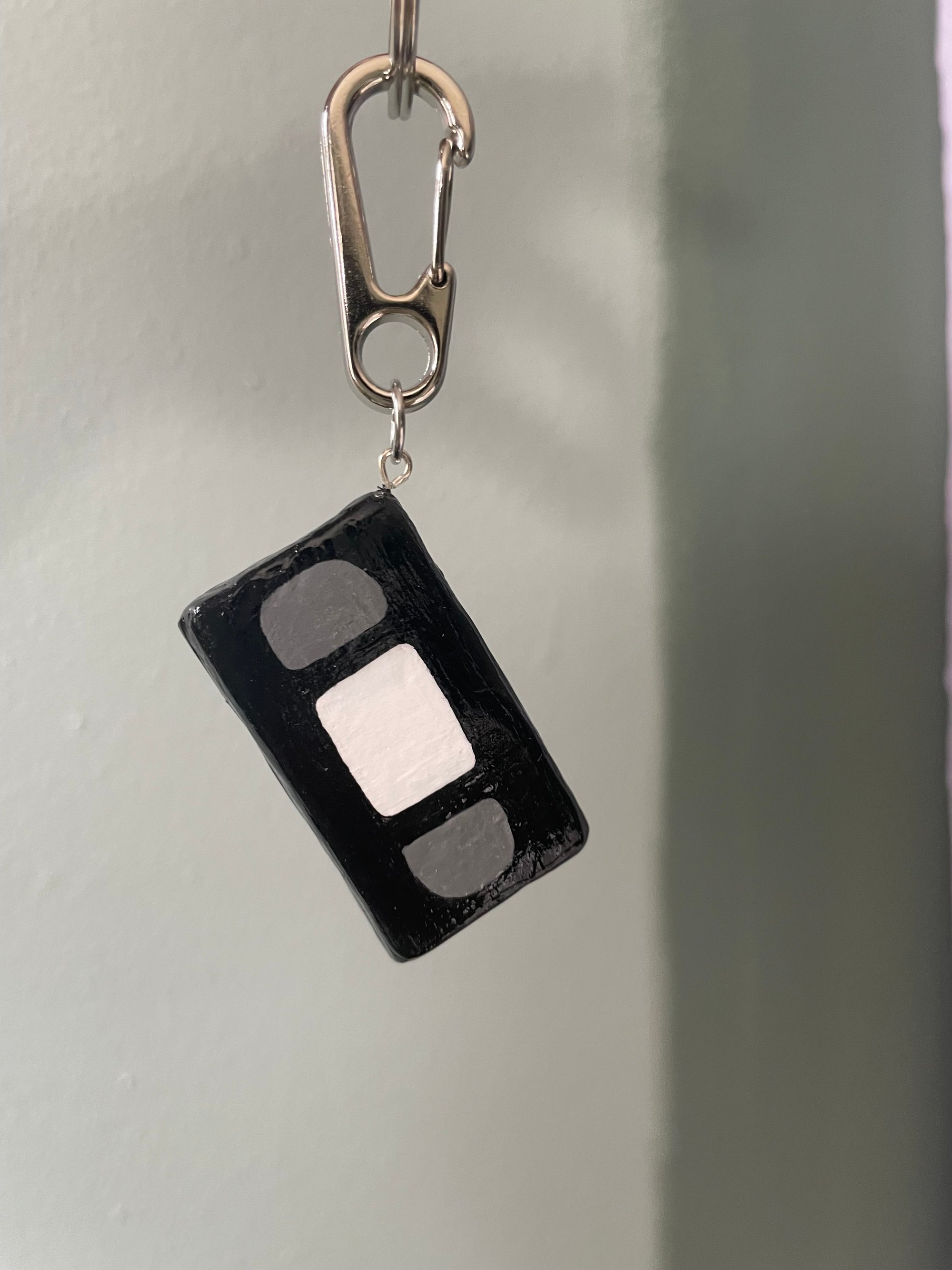 made to adorn your bag or your belt loop :) this tiny VHS is a glossy, handmade replica of the OG, measuring about 1 x 1.5 in.