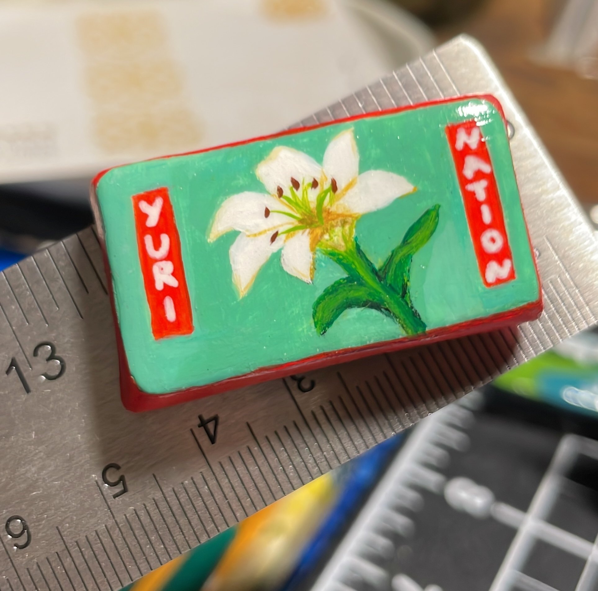 we stand for the flag!! designed in devotion to the wide world of yuri, this serene botanical magnet features a finely detailed white lily and a jade and scarlet color palette.